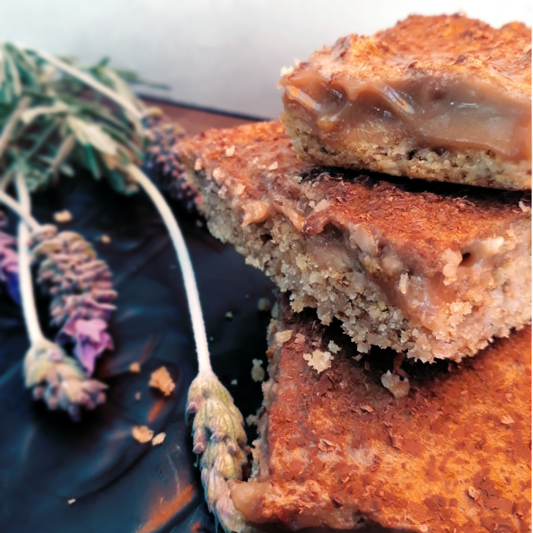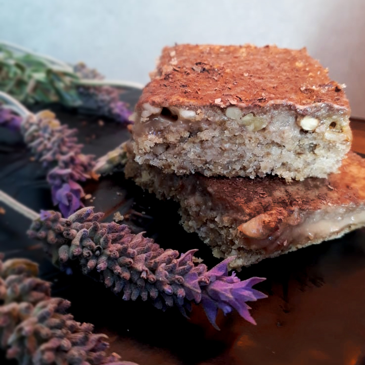 ➡️ Una vez que sale del horno, colocar una capa de dulce de leche encima y las nueces picadas.