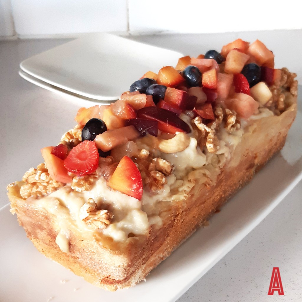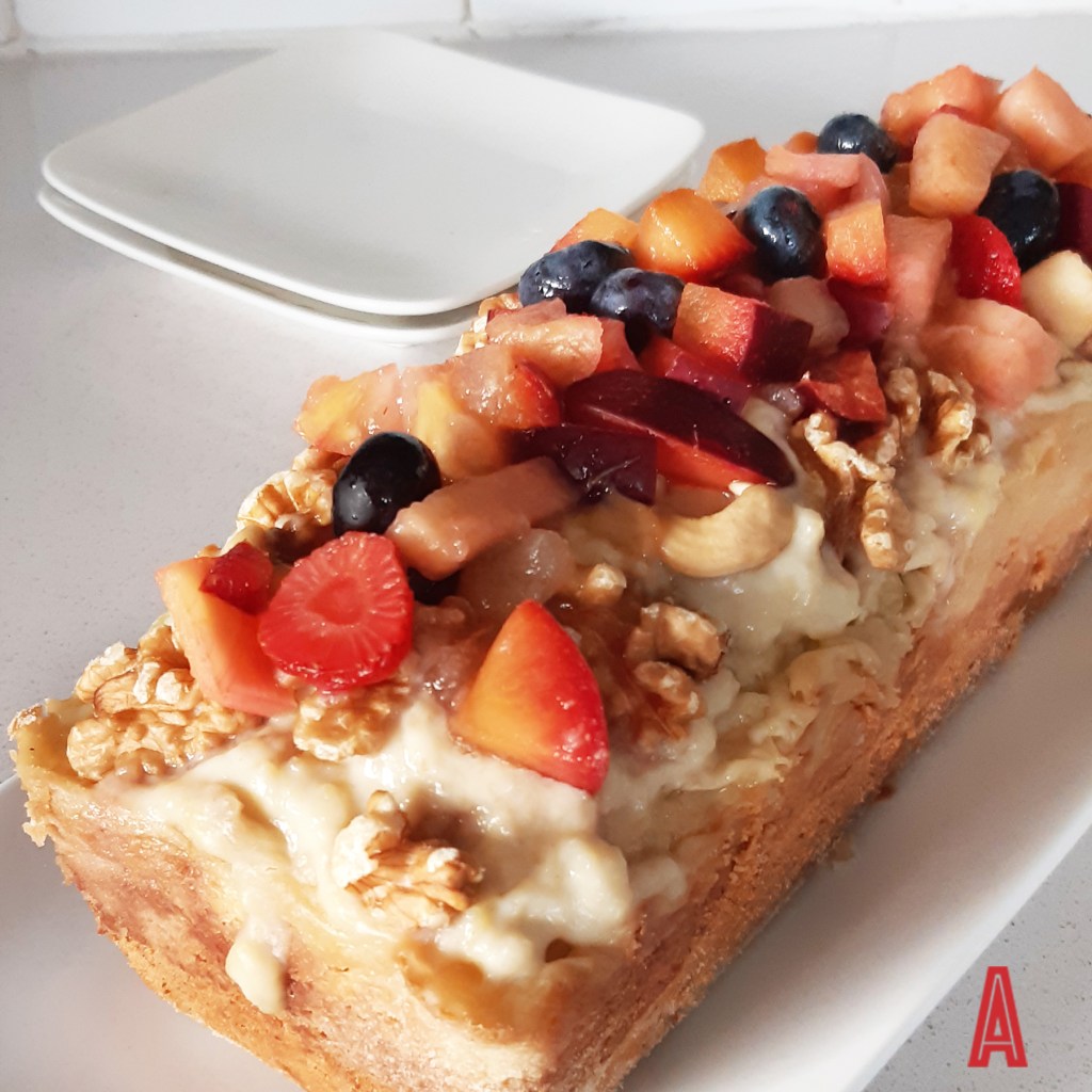 Hice la típica «doggy bag» de una cena con mis suegros, y a las 1:40am se me ocurrió decorar este bebé con la ensalada de frutas de mi suegra! para que se pegue y tome sabor. No me equivoqué en hacerlo! siempre es mejor dejar reposar las preparaciones antes de cortarlas.